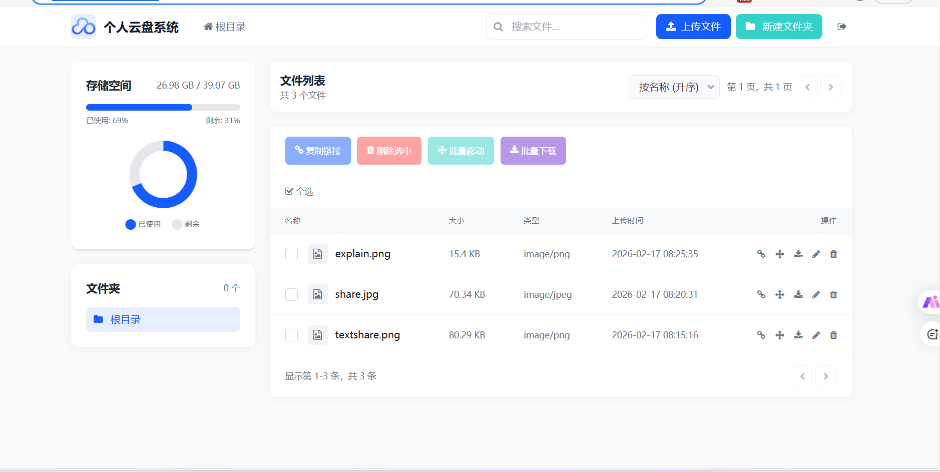 简介: 全新轻量化个人云盘系统源码 PC+H5自适应 图床功能、文件外链、文件夹操作、文件上传与管理等全方位功能 助力个人高效管理云盘资源 自适应pc和手机端